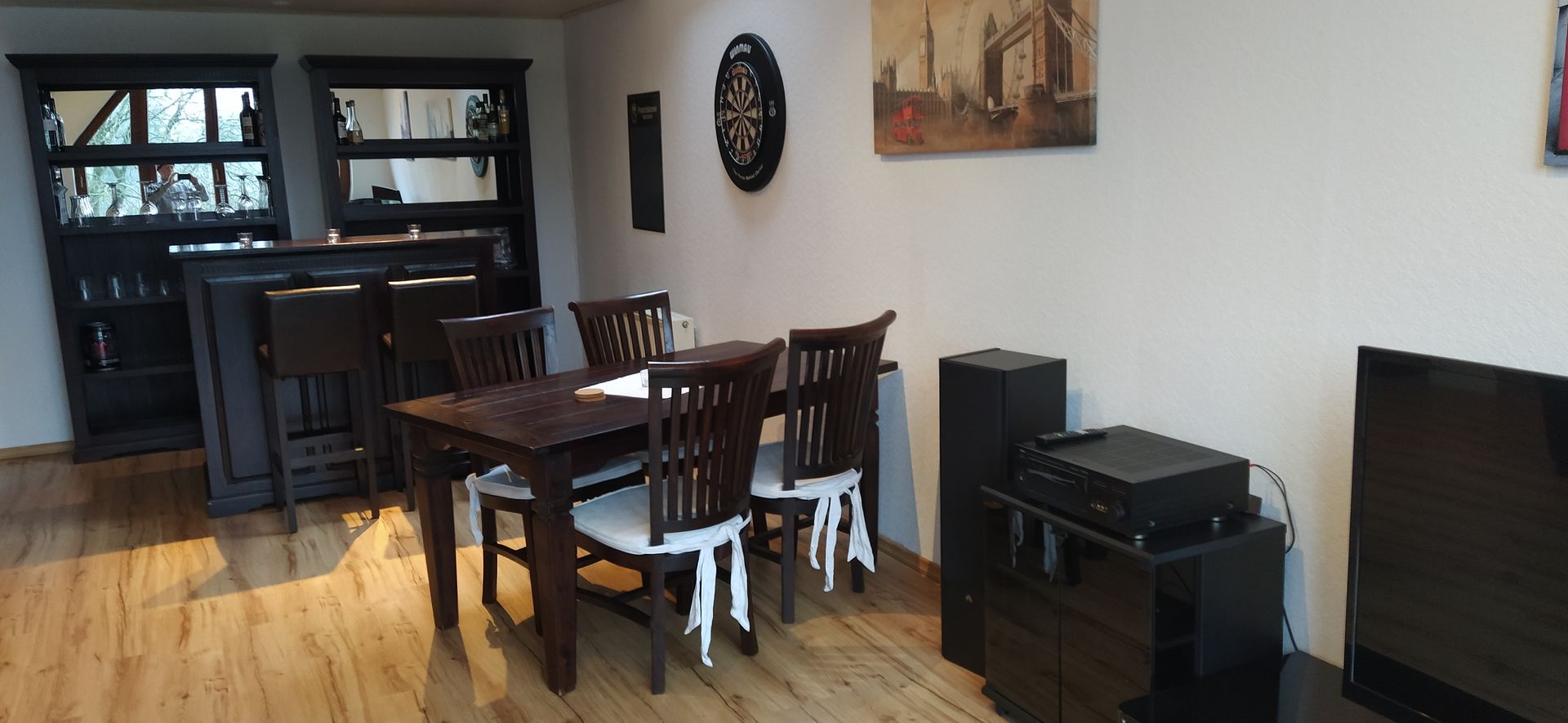 1 großes Wohnzimmer (45qm) mit Bar + Dartscheibe, Sitzecke, Stehtisch, Esstisch und Kinderhochstuhl